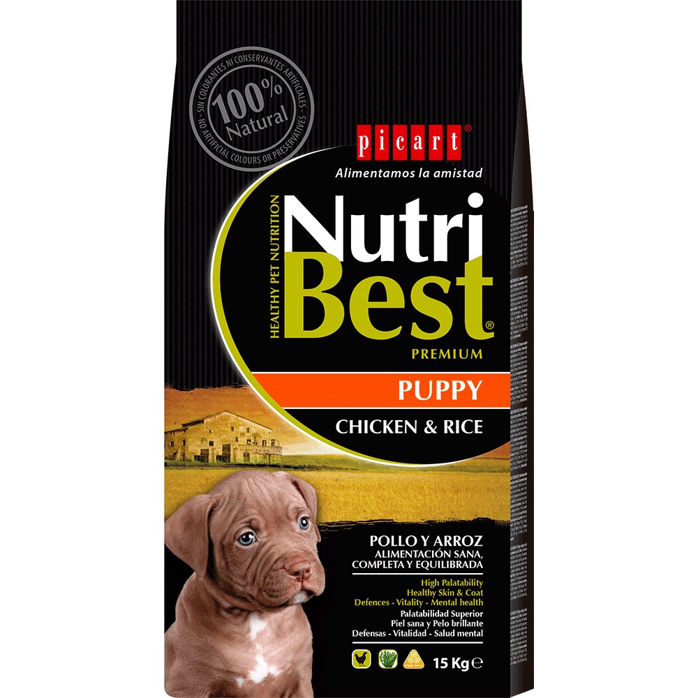 ΑΝΤΙΣΤΑΣΕΙΣ:Βιταμίνες Α και Ε, μαζί με ιχνοστοιχεία χαλκού και σεληνίου είναι απαραίτητα για τη διατήρηση ενός ισχυρού ανοσοποιητικού συστήματος.ΨΥΧΑΓΩΓΙΚΗ ΥΓΕΙΑ:Τα Omega 3 και 6, που λαμβάνονται από ιχθυέλαιο, ευνοούν την εκμάθηση και την ανάπτυξη διαφορετικών λειτουργιών του εγκεφάλου.VITALITY:Η μαγιά μπύρας, πλούσια σε βιταμίνες Β, βοηθά στη ρύθμιση του μεταβολισμού και της παραγωγής γλυκόζης αίματος, η οποία αυξάνει την ενέργεια και τη ζωτικότητα του κουταβιού σας.ΔΕΡΜΑ ΚΑΙ ΥΓΕΙΑ:Το NutriBest ενσωματώνει τα φύκια, μια πλούσια πηγή φυσικών μεταλλικών στοιχείων, ιχνοστοιχείων, βιταμινών και αμινοξέων. Τρέφουν και ενυδατώνουν το δέρμα, προστατεύουν τα κύτταρα σας και διατηρούν τα μαλλιά δυνατά και λαμπερά.ΣύνθεσηΚρέατα και ζωικά υποπροϊόντα (26%) (ελάχιστο 4% αφυδατωμένο κοτόπουλο). Καλαμπόκι. Σόγια .Έλαια και λίπη (ελάχιστο 0,5% ιχθυέλαιο). Γλουτένη καλαμποκιού. Δέντρο χαρουπιού Σιτάρι. Ρύζι (τουλάχιστον 4%). Πάστα τεύτλων. Ζύμη (τουλάχιστον 1% ζύμης ζυθοποιίας). Ορυκτά. Φύκη (ελάχιστο 0,5%). Prebiotic MOS. Απόσπασμα της Yucca.Αναλυτικά στοιχείαΠρωτεΐνη: 30%, Έλαια και λίπη: 14%, Ανόργανη ύλη: 7,5%, Ακατέργαστες ίνες: 3%